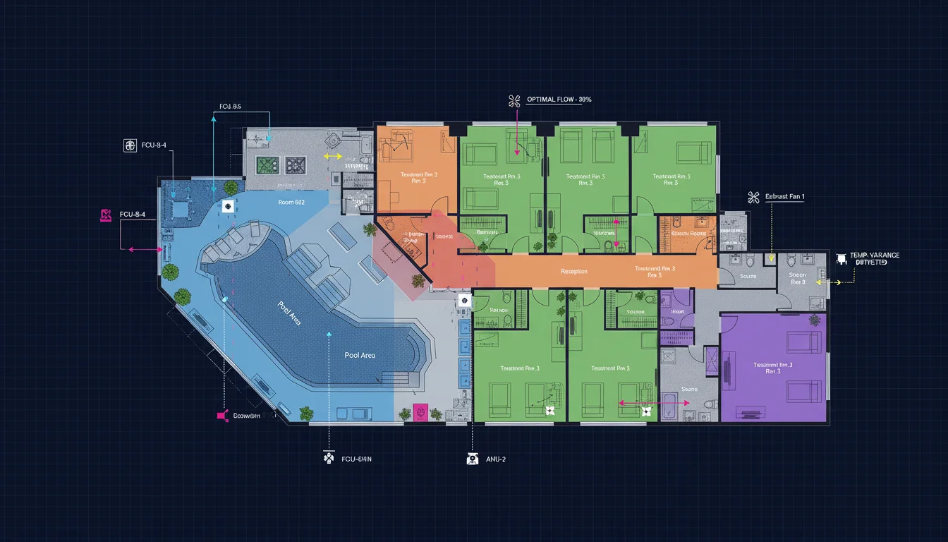 Our client operates a luxury hotel with a spa floor containing over 40 rooms — treatment rooms, locker rooms, a pool/lounge area, sauna, steam room, prep rooms, and back-of-house corridors. Some of these rooms have curved walls. Some share ceiling plenums with adjacent spaces. The mechanical plan includes 14 FCUs, dozens of supply diffusers, exhaust grilles, and a dense network of ductwork.